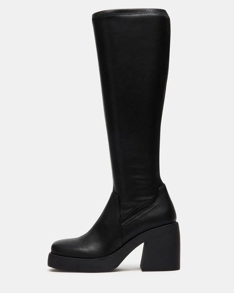 The BERKLEIGH square toe knee boot gives you a sleek and defined silhouette with a stretch fabric construction and platform sole with a block heel.