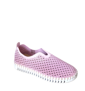 ILSE JACOBSEN HORNBÆK Tulip Slip On. Crafted with an upper of recycled microfiber and a captivating laser-cut pattern, these shoes perfectly blend style and eco-friendly design. The iconic Tulip outsole, made from 75% natural rubber and 25% recycled rubber, is expertly stitched with matching recycled thread, entirely glue-free. Inside, the pig suede-lined insole provides remarkable comfort through added padding and support. With a variety of color options to choose from, these shoes are the ideal fusion of fashion and environmentally-conscious choices. Elevate your footwear collection with this iconic and comfortable choice.